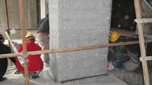 鋼絲繩網片聚合物砂漿加固技術是鋼絲繩網片通過粘合強度及彎曲強度優秀的滲透性聚合物砂漿附著,與原本的混凝土形成一體,共同承載荷載作用的彎矩和剪力。